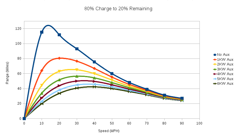 Given that one doesn't drive far with no auxiliaries, especially now with winter beginning to make itself felt, I was interested to see what the range figures were when some heat was being put into the car. The picture below shows the same "no auxiliaries" line in dark blue, with 1 KW through 6 KW auxiliaries consumption range lines shown beneath.