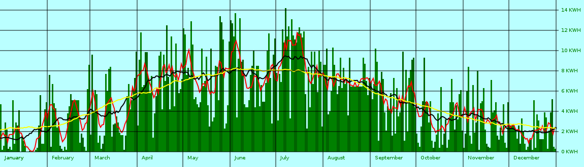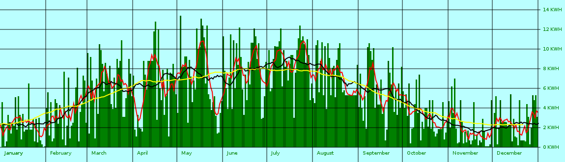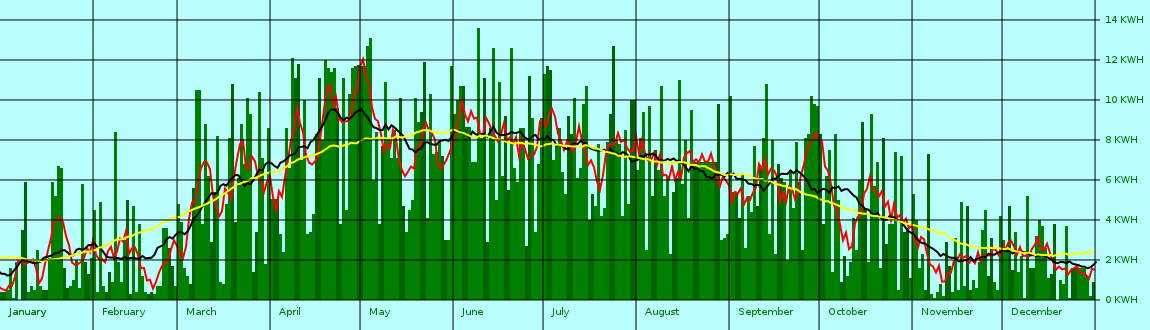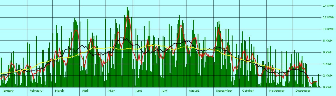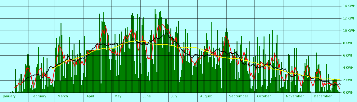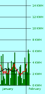 | Green bars: | Power generated each day in KWH (dark green for Saturdays and Sundays) |